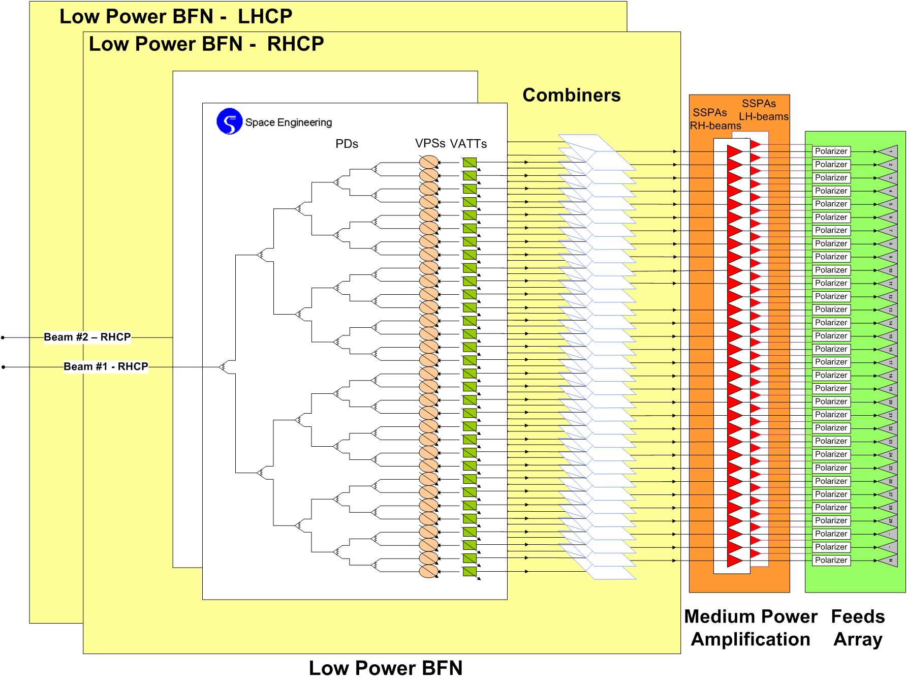 The active lens is made of 218 active elements each one radiating both circular polarization by means of two GaN SSPAs. Both the front and the back array are aperiodic to simplify the RF chain inside the discrete lens. A thermal control system with only 27 heat pipes and 4 loop heat pipes has been designed to dissipate the heat power dissipated by the active components. A supporting structure with high modulus carbon fibers was designed to limit the antenna mass budget.