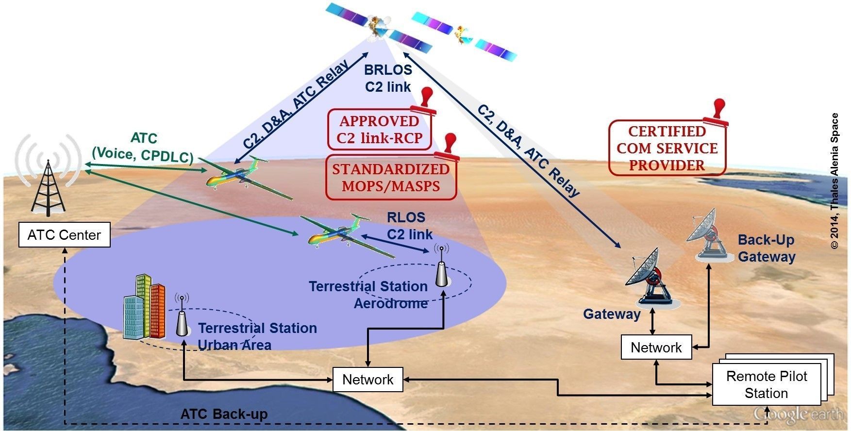 The following figure depicts a generic architecture for a C2 link satcom system (BRLOS) conveying C2, Detect & Avoid data and relaying ATC voice and ATC data (CPDLC). For the sake of completeness, the terrestrial link (RLOS) is as well represented.