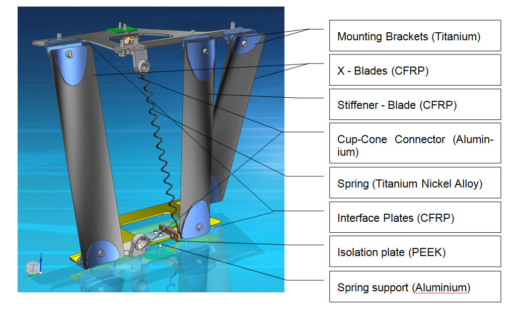The most critical and hence most important parts at DUDM level are the blades. CFRP was chosen for the blades mainly due to the low and controllable coefficient of thermal expansion (CTE) in axial direction. This is important for low thermal distortion and high accuracy. The Mounting Brackets are made of TiAl6 in order to meet a low CTE and high stiffness. The damping spring is made of a Titanium Nickel Alloy which is isolated from the structure by plates made out of PEEK.