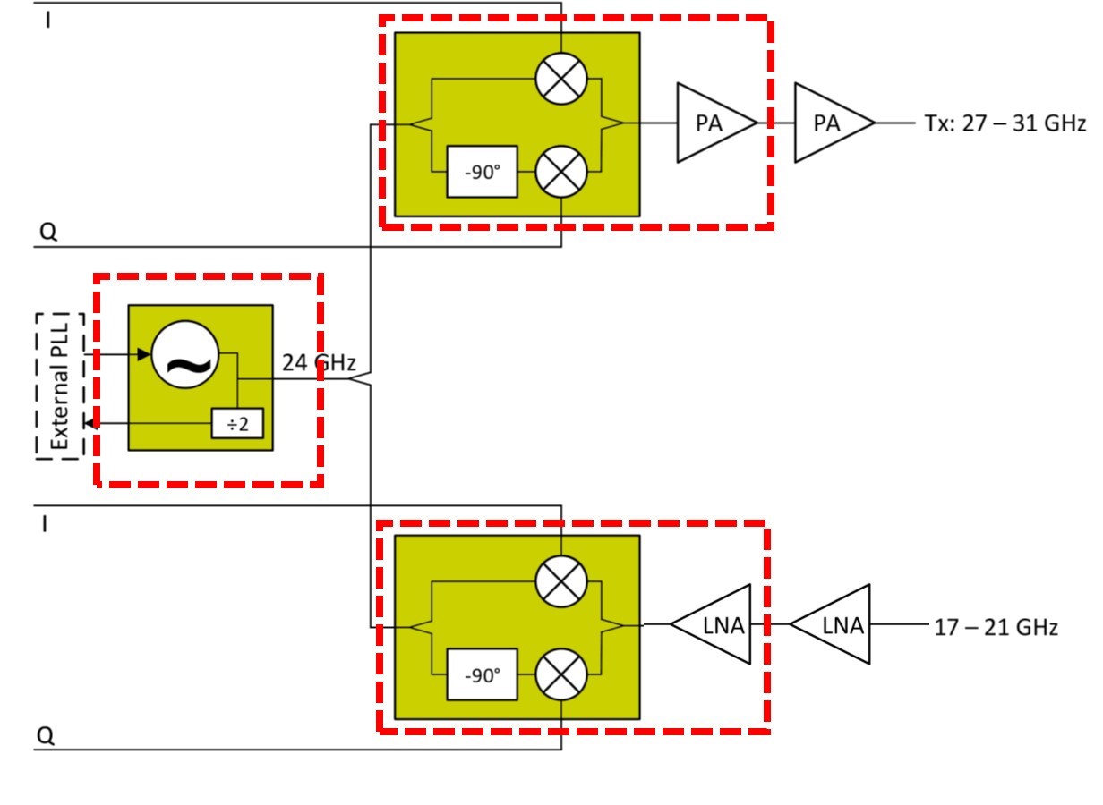 This project lead to the design and build of 5 x core chip (or multifunction) MMICs for operation in the satellite uplink and downlink frequency bands (~29GHz and ~19GHz). As the MMICs are highly integrated and included functionalities such as VCOs (with locking supplied by a low frequency PLL), LO amplification, LNAs, PAs and mixers over both frequency bands, a simplified solution for chip integrators is supplied. All core chips are packaged using a QFN (Quad Flatpack No Leads) packages which makes integration even easier.