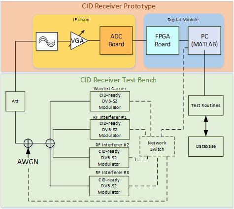 The test bench comprises four DVB-S2 modulators combined to simulate different interference scenarios. The signal and noise amplitude levels are adjusted to simulate a satellite environment. Because both the modulator signal output and the prototype DVB-CIDD receiver input are situated in the L-band frequency region, no frequency conversion is implemented. The DVB-CIDD intermediate frequency chain consists of filtering and amplification blocks and a conversion from the analogue to digital domain. The detection algorithm will be applied in an FPGA, to make the system flexible for future changes in algorithm and/or DVB-CID standard. Finally, the FPGA interconnects with a PC that synchronizes with the modulators and the test routine database.