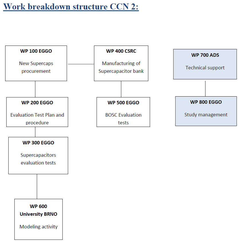 3/ This project was extended by a CCN2 with the aim to extend the evaluation of the original Supercapacitors in terms of suitability for space applications. Characterisation tests, environmental tests, life tests were carried out. Another activity was to evaluate new Supercapacitors models Maxwell BCAP0010 P270 and Nesscap EHSR 0010C0-002R7P Pintype, which is modified in terms of better hermeticity than the original Nesscap. This extended study also included a new BOSCs modification in 8 versions where 7 types are 4s1p modifications which means 4 cells connected in series on a PCB without housing and 1 pc of BOSC 15s2p made of 15 pairs of cells in series of new Nesscap Pintype also without housing. The Nesscap pintype cell showed an inferior performance as compared to the original Nesscap cells, possibly due to a suboptimal sealing. The Maxwell BCAP0010 showed a good performance and can be used as a viable backup for the Nesscap cells. The tests of the 4s1p BOSCs showed that a balancing system is needed for keeping the cells in a balanced state during the cycling. A balancing factor of 50 (ratio between balancing current and leakage current) seemed to be sufficient. The 15s2p BOSC, which was based on the Nesscap Pintype cell showed an inferior performance as the 15s2p BOSC based on the previous Nesscap cells.