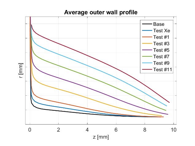 Figure 2 – Reconstruction of the profile of Sitael HT5k outer ceramic wall starting from experimental data. Data have been collected at T0, after 30 hours of test with xenon and every ~30h test with a 75%Kr-25%Xe mixture. (Copyright: Sitael SpA).