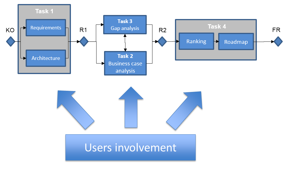 Task 1 addresses the service requirements and architecture. In Task 2 the business case is analysed, then in Task 3 the possible technical gaps are identified. Finally, in Task 4 a ranking of the services is performed and, for the two most promising ones, an implementation roadmap established.