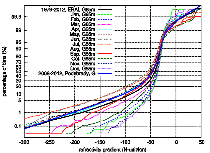 Figure 5: Monthly cumulative distributions of the vertical gradient in the lowest 65 m above surface; latitude 50.25, longitude 15.00