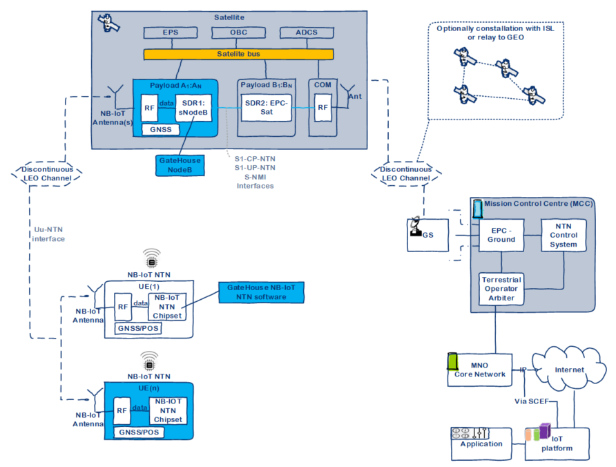 The implementation is divided in two 1) a space segment which is installed on a software defined radio (SDR) payload with applicable antenna system. 2) the solution for the UE which can be installed either on dedicated HW or be integrated into a suitable purpose specific chipset.