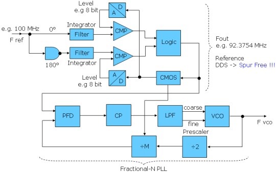 While operating in fractional mode with divider settings close to an integer value, the generation of ‘integer-N boundary’ spurs becomes dominant. Expanding the fractional part is possible by employing a second reference frequency – or moving the existing reference away from its nominal value. The reference frequency shift is subject of the circuitry sketched below.