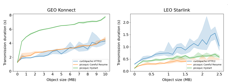 Over a GEO satellite connection (Eutelsat Konnect), the results show that QUIC with Careful Resume achieves nearly identical transmission times to those of the operator’s proprietary TCP PEP, which is only applicable to unencrypted HTTP/2 traffic. In contrast, conventional encrypted transports such as unmodified QUIC (HyStart) or VPN-based connections exhibit significantly longer transfer durations.