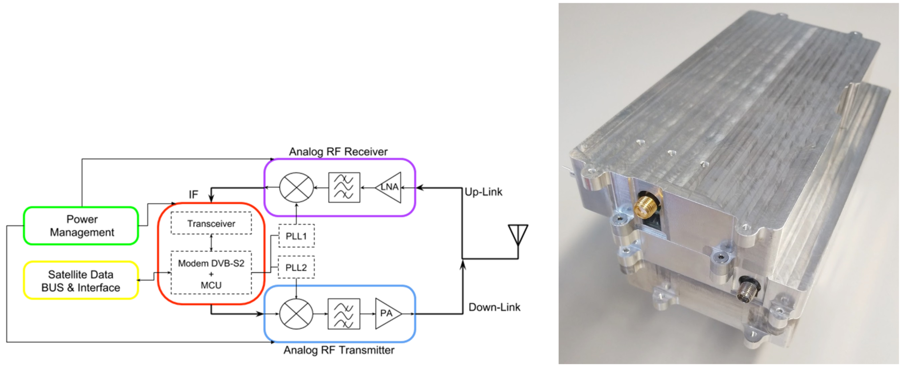 This project aimed at filling such a gap, through the realisation of a miniaturised regenerative Transceiver for Low Earth Orbit (LEO) CubeSats communicating with ground stations. The choice of the K/Ka-band frequencies in both uplink and downlink (receiving at 27.6-30.0 GHz; transmitting at 17.8-20.2 GHz) guarantees a high data rate, suitable for DVB-S2 capability.
