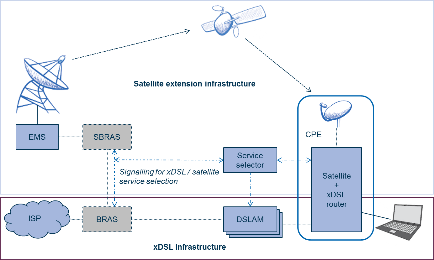 • Satellite broadband remote access server (SBRAS) –separates routing paths depending on the service selection assessment (service selector), including signalling between DSLAM, teleport and end-user terminal.