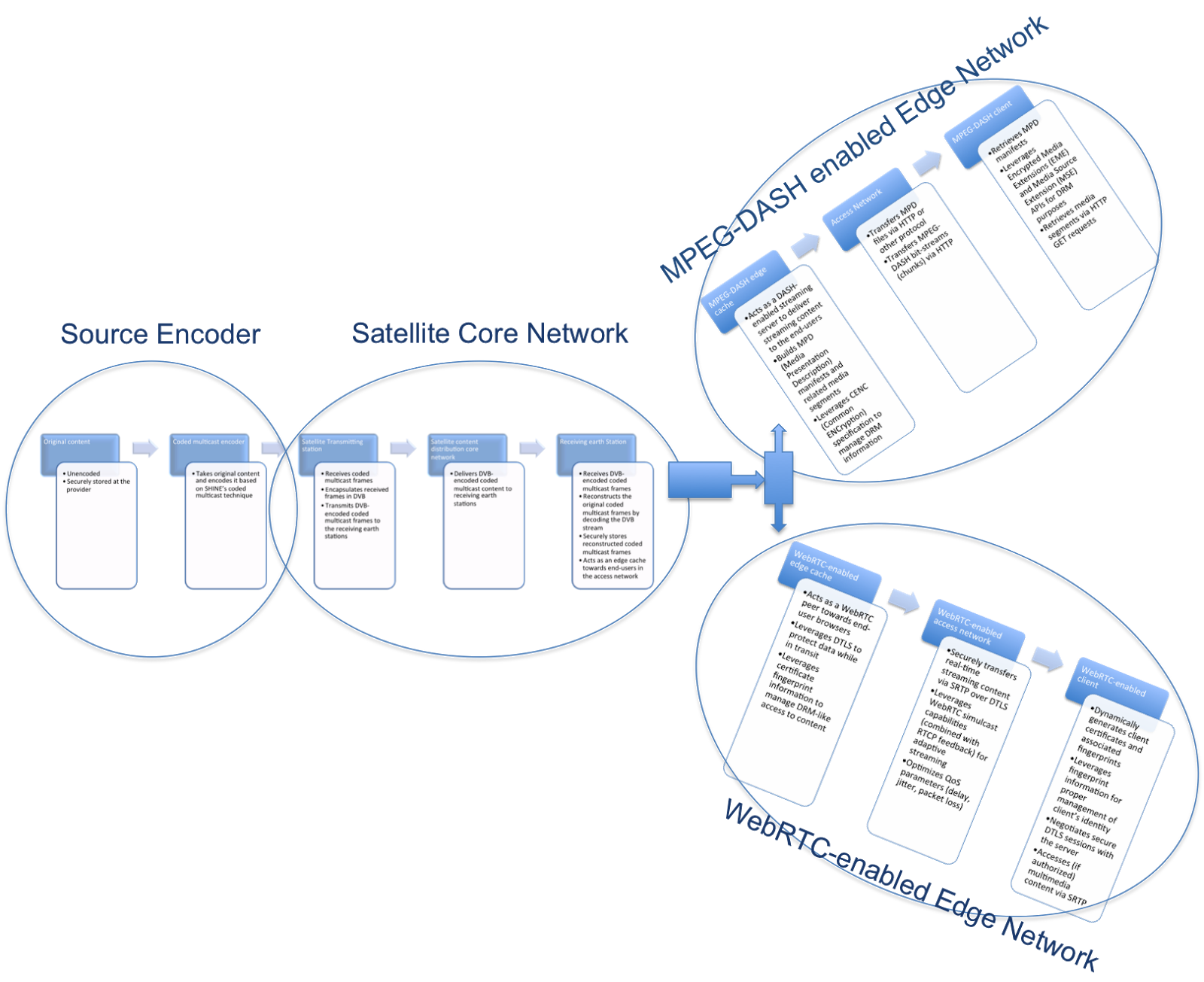 - the core satellite-enabled communication infrastructure, looking after DVB-enabled transmission of coded multicast frames from the content provider to the edge caches, both during the cache population phase and during the steady-state operation of the CDN;