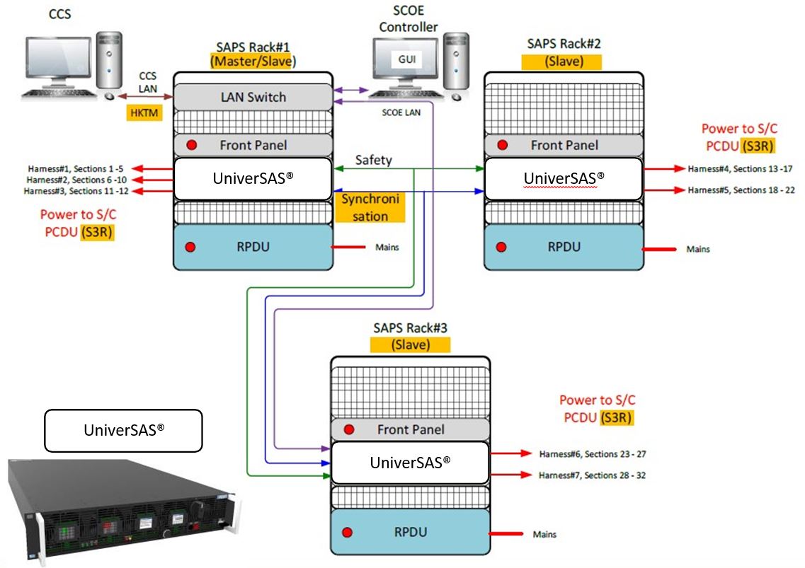 The Power Special Check-Out Equipment (SCOE) is part of the electrical ground Support Equipment that provides via the current Atos UniverSAS® product the required electrical power, simulates the real spacecraft battery and the solar array behaviour and provides monitoring of some onboard electrical parameters. It is used during all phases of the spacecraft integration and test, i.e. from Avionics Test Bench (ATB) and Service Module (SVM) integration up to the launch campaign. The main objective is to extend the capabilities of the Atos UniverSAS® product to cover also different Telecom satellite requirements through generic firmware and software solutions.