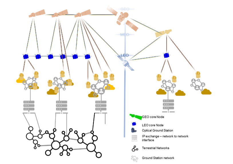 Global telecommunication systems require networking and optical technologies in order to provide the appropriate tools to address the growing capacity needs of our society. Future telecom satellites are to be seamlessly integrated into the terrestrial high-capacity networks, to extend the network in space. This means that large coverage can be achieved, and latency and connection costs can be reduced to remote areas.