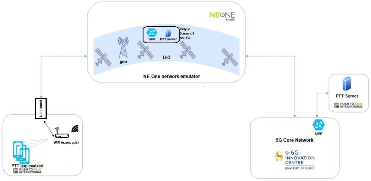 The first demonstration was of emergency services use-case where gNBs, a UPF and press to talk (PTT) application is embedded into payloads of a LEO satellite system, to allow local PTT communication between groups of UEs involved in emergency response. A diagram of this demonstration is shown below: