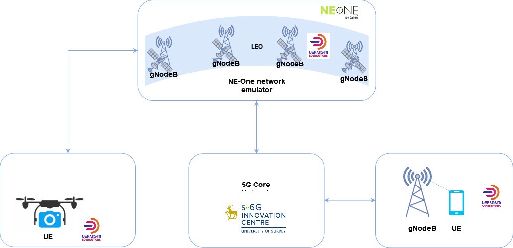 The third and final use-case demonstrated was event support where a drone was connected over the LEO system. There are two main scenarios, the first was to embed a gNB on the drone to cover UEs on the ground below the drone, and in this case the LEO satellite system was used to connect the drone to a UPF and other 5G CN functions on the ground, and the LEO payload is transparent. The second scenario was where a gNB was embedded into the LEO payload and the drone carried a UE, so that a camera can be carried on the drone for surveillance. A diagram of scenario two of this demonstration is shown below: